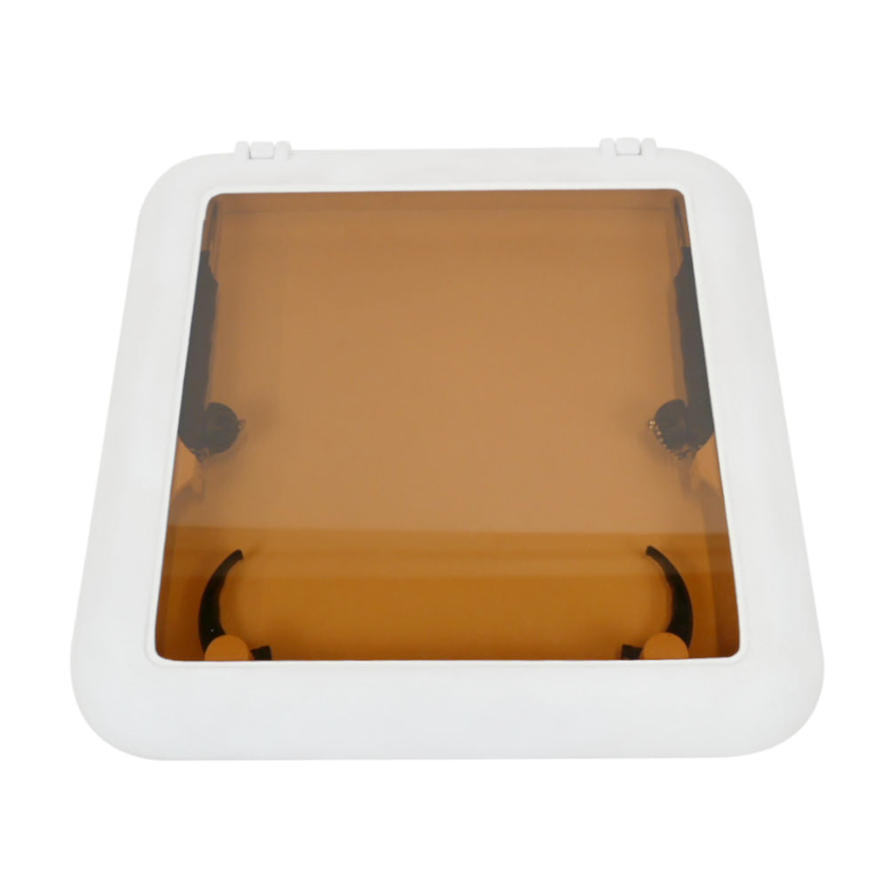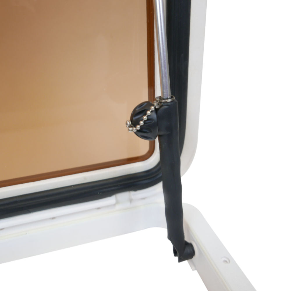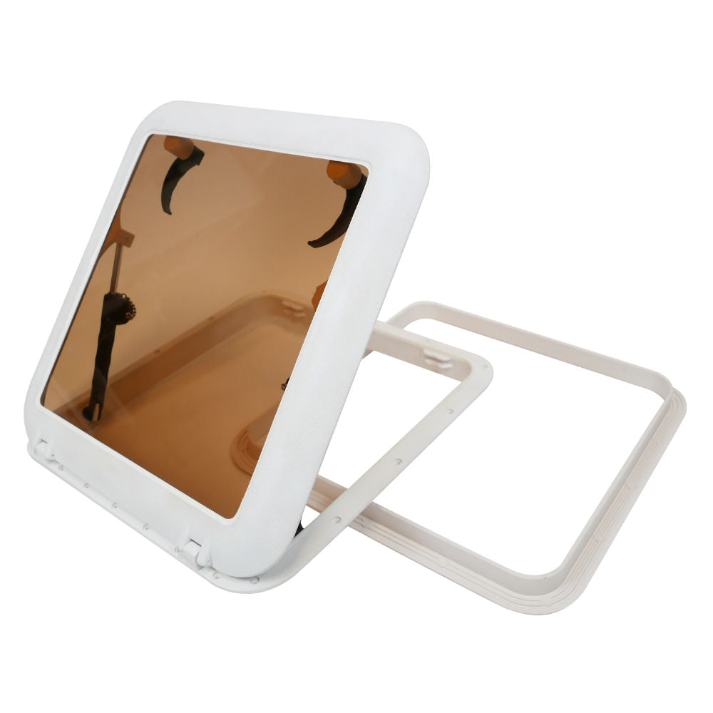A Bronze Tinted Glass Hatch in an Off-White Grain Finish, perfect for Boats and Caravans. Low Profile.
