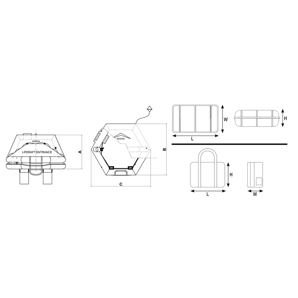 | Code | Max Persons | Weight (kg) | Container | Length | Width | Height | A | B | C |