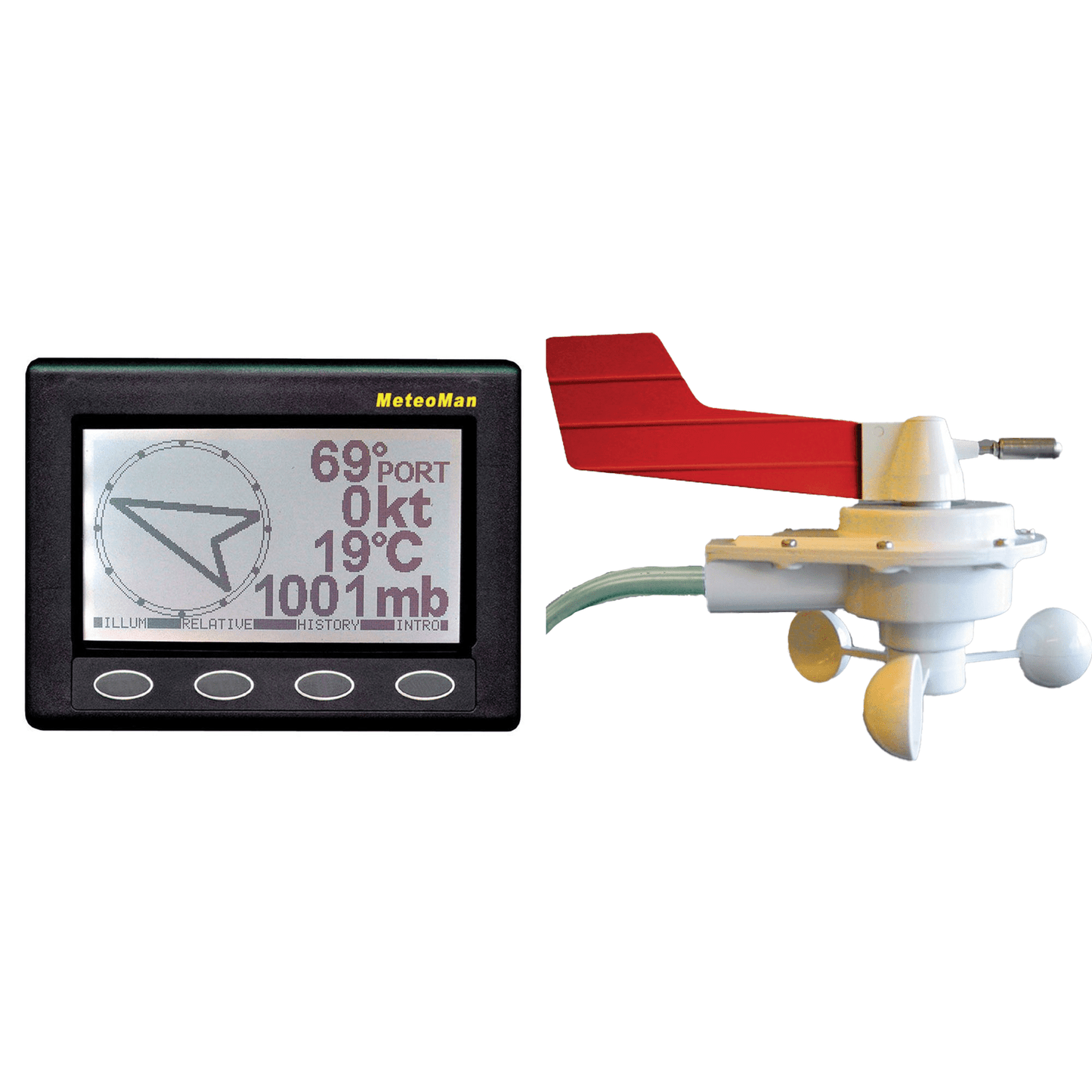 This Meteoman version is supplied with an NMEA Wind sensor which provides wind direction, wind speed and external temperature. The Meteoman provides reliable meteorological information for the yachtsman. The main display shows the wind speed and direction, the ambient temperature and the barometric pressure.