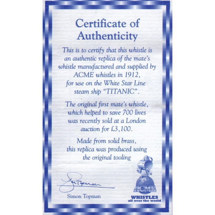 Authentic replica of the whistle used by Titanic's First Mate, as used so dramatically in the film to facilitate Kate Winslet's rescue. British-made by Acme, who supplied the White Star Line in 1912, using the original tooling.