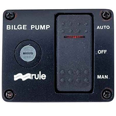 A black plastic panel with an internally lit 3 way rocker switch (Manual, Off and Automatic). Features with Rule 'Fail-Safe' spring-return to "off" from the manual position. Built-in fuse-holder included.