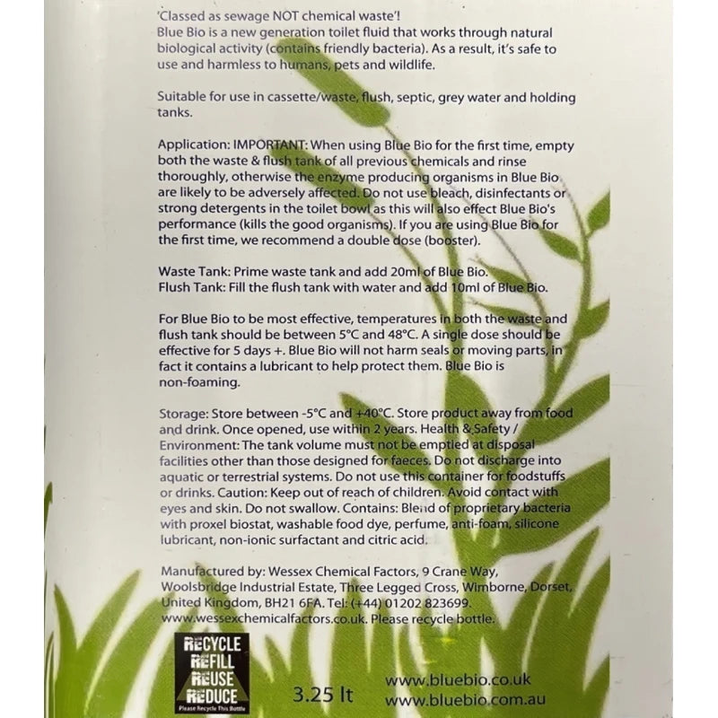 Blue Bio toilet fluid works with mother nature to breakdown waste whether it's in your caravan, motorhome, boat or in the sewage plant. Blue Bio toilet fluid is formaldehyde, glutaraldehyde and biocide free (harmful substances contained in many toilet fluids) and works with natural bacteria to breakdown sewage. This greatly reduces its impact on the environment and brings disposal costs down (associated with chemical disposal). It's non-hazardous and 100% biodegradable, making it the friendly chemical toilet fluid that works!