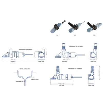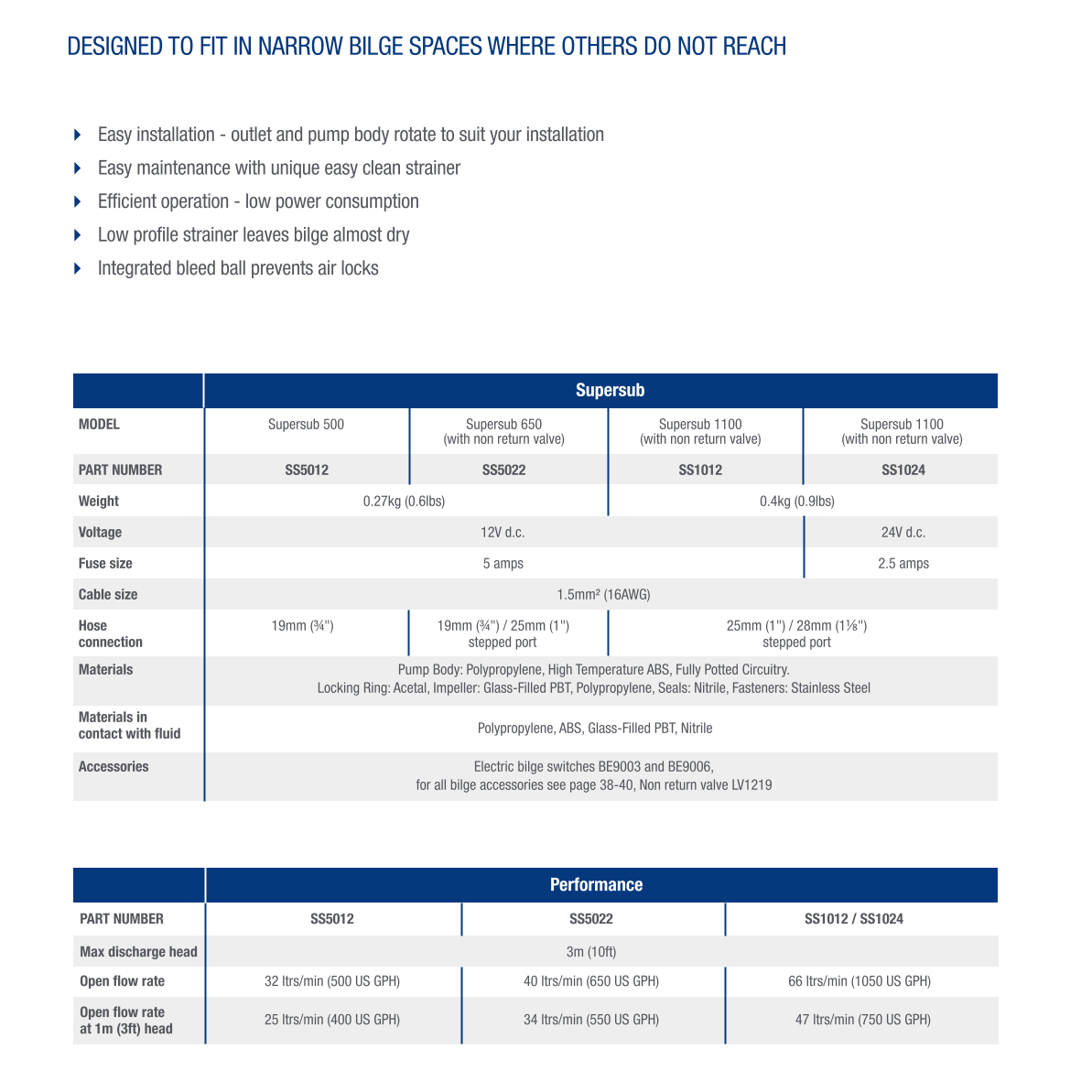 Supersub Family - Narrow, Low profile bilge pump fits deep down in small/awkward bilge spaces where other pumps won't fit.
